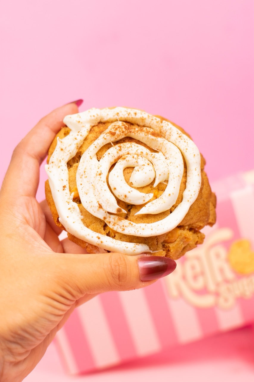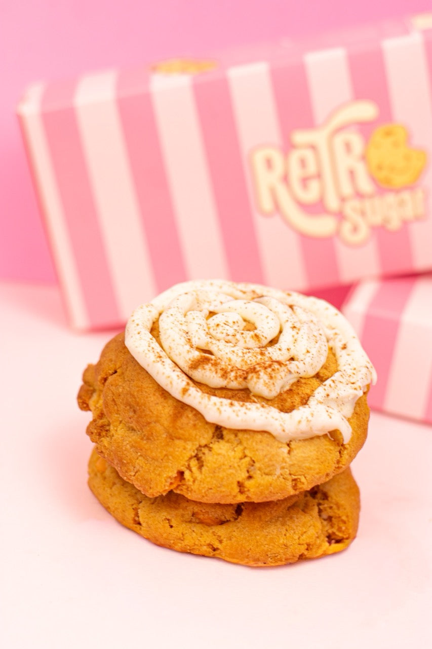 Pumpkin Spice Latte cookie with pumpkin purée in the dough, pumpkin-flavored chocolate chips, and a creamy white-chocolate coffee filling.